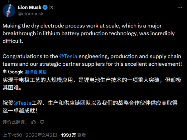 [Techweb]特斯拉在锂电池生产领域取得了重大技术突破。埃隆•马斯克在X平台上发文称,实现干电极工艺的大规模应用是锂电池生产技术的一项卓越成就,同时也极具挑战性。他向特斯拉的工程、生产和供应链团队以及战略合作伙伴供应商表示了热烈祝贺。